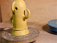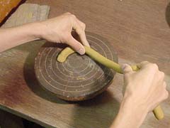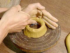 1. 粘土でひもを作ってろくろの上に円形にのせます。左手で、ろくろを回しながら、粘土がろくろと密着するように押さえます。右手はひもを持ってるだけです。1周回った最後がくっつきやすいように、ひもの最初の部分が斜めになってるのがわかりますか?