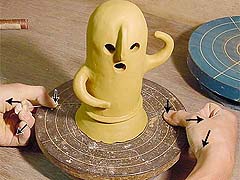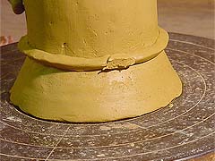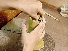 両手でつまんで厚みを少し薄くしながら、両手の間を少し詰めます。すると、薄くのばされた分の粘土が上に延びる、というわけです。これも、いっぺんにやるとムラが出来て厚みも高さもそろいません。3周、4周するつもりで気長に少しづつ。厚みの目標は7ミリ。
