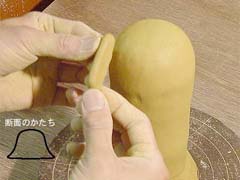 12. 鼻をつくります。本体とのバランスを見て長さや高さを調整しましょう。画像の断面のように、本体とくっつけるときになじませる部分をつくっておきます。