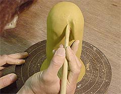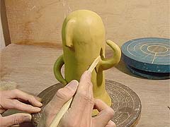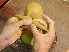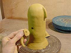 13. 鼻と本体の接着部分に少し水をつけてゆびでこすり、ぬるぬるの「ドベ」になったらくっつけます。へらでつなぎ目をきれいにならしておきましょう。
