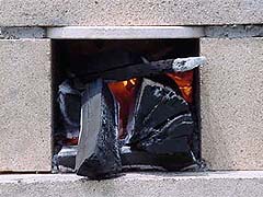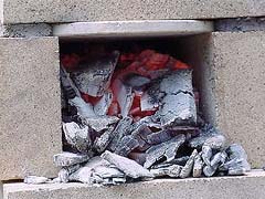 下の部屋は真っ赤になった炭でいっぱいです。でも、一番奥、作品室に上がる部分は炎の通路を開けてあります。