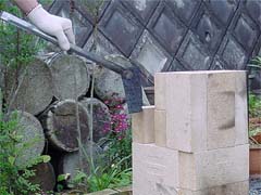 ※※レンガの取り扱いには軍手・保護メガネなどの保護具をして、十分注意して作業してください。角で手を切ったり、落としたり、欠けてかけらが飛んできたりしてけがをすることがあります。 ※※