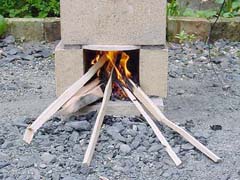 4-4. 下の方にオキ(炎が出なくなった、炭火のような薪)がたまりだしたので、焚き口の手前にレンガを立てて下のオキに空気が当たりやすいようにしてみました。